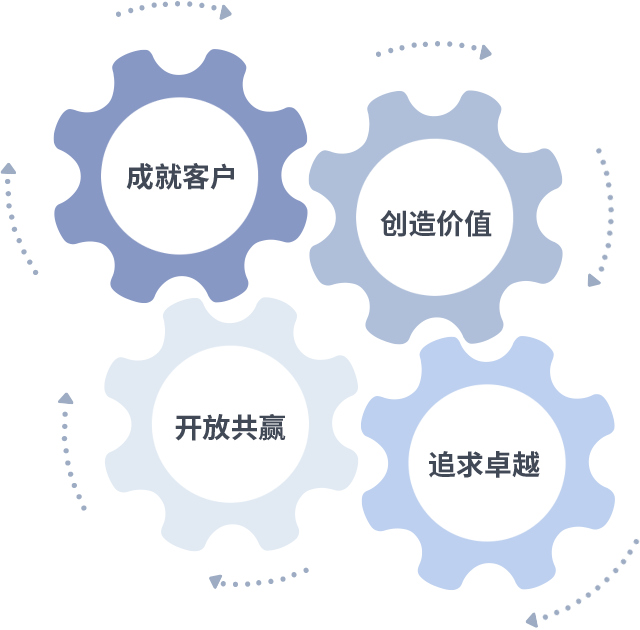 成就客户是一切决策的出发点,,,创造价值是衡量所有工作的标准,,追求卓越是我们做事做人的态度,,,开放共赢是我们的格局也是最终的结果。。。。价值观的齿轮环环相扣,,,推动着组织里的每个人不断向前。。。